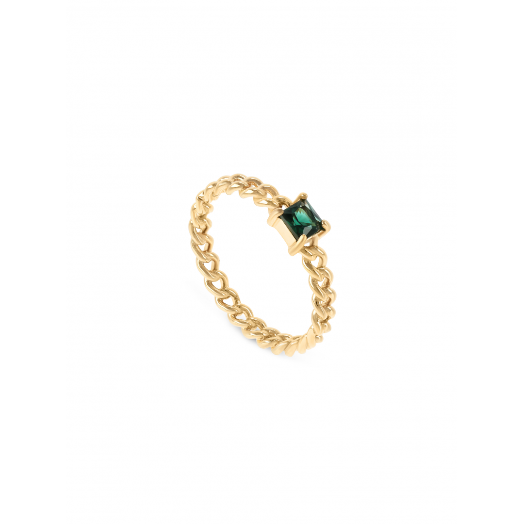 O anel One London 40 dourado da coleção London é um anel fino com uma malha de pequenos elos entrelaçados e espaçados entre si e um pequeno cristail zircónia verde rectangular no topo do anel. É uma peça de joalharia de design delicado, com um destaque central que o distingue numa combinação de anéis. O entrelaçado contínuo da malha lembra a de um colar e cria um efeito visual harmonioso, perfeito para combinar com outros anéis ONE.