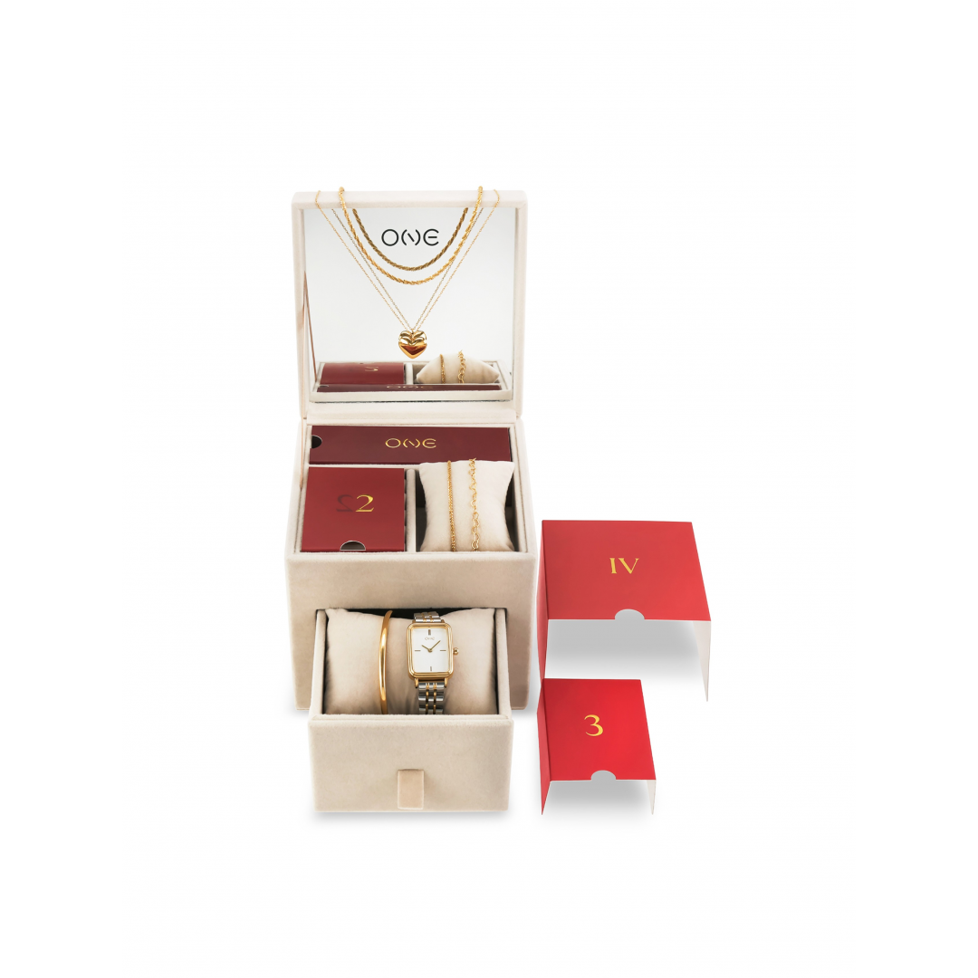 O primeiro e bem exclusivo calendário do advento da ONE é muito mais do que uma surpresa diária, é um guarda-joias premium em veludo branco que vais querer guardar para sempre. Dentro desta edição encontras uma combinação única de peças douradas que te permitem criar um verdadeiro full look ONE. O grande destaque vai para o relógio analógico bicolor, que contrasta lindamente com os detalhes dourados das restantes peças. Inclui ainda a best-seller pulseira escrava Dazzle, um par de brincos com centro em madrepérola, duas pulseiras douradas (uma delas com elos em formato de coração delicadamente entrelaçados) e dois colares especiais: um com pendente de coração dourado e outro com uma malha densa e entrelaçada que respira sofisticação