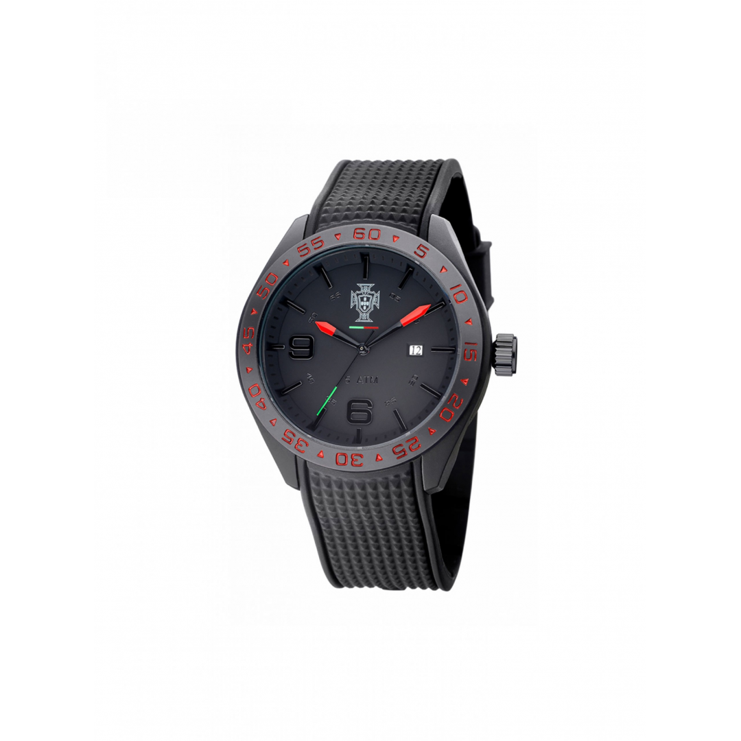 Relógio One Champions OG1066PP01S. Relógio comemorativo de Portugal como Campeão Europeu de Futebol. Com o preto como cor predominante e apontamento de vermelho e verde a lembrar a bandeira nacional, com caixa de 44 mm. Analógico com calendário, logotipo da FPF Federação Portuguesa de Futebol gravado no mostrador e com bracelete em silicone preta.